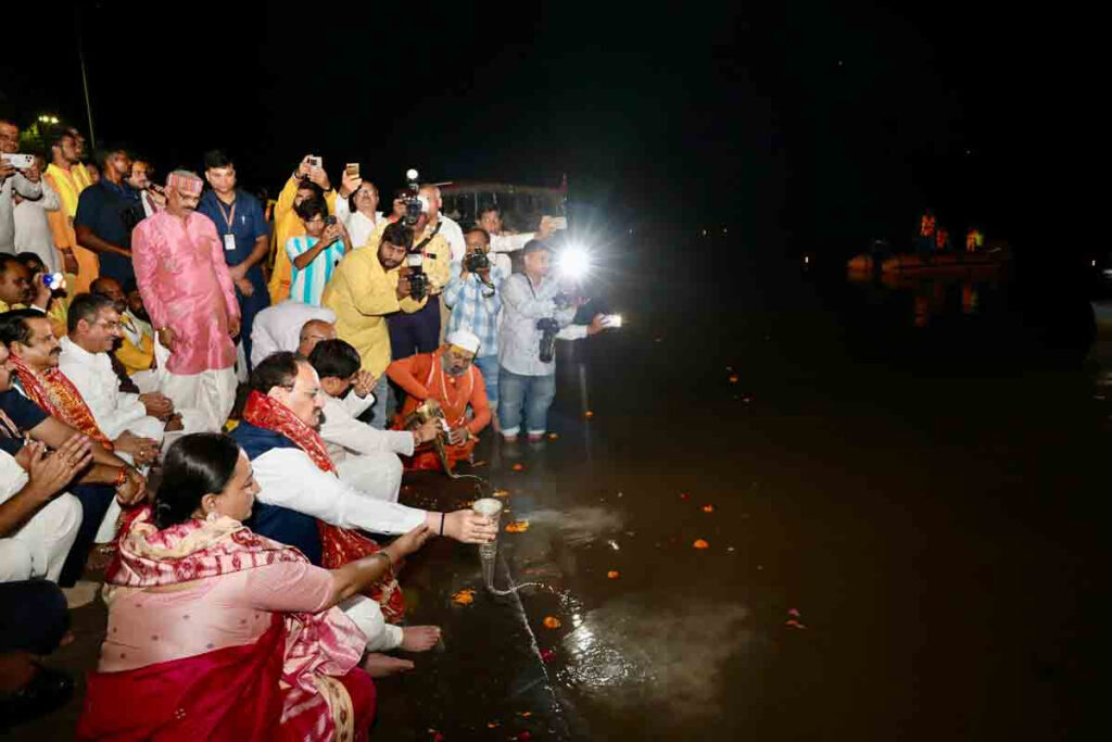 संस्कारधानी जबलपुर के पावन ग्वारीघाट पर आज माननीय केंद्रीय मंत्री श्री @JPNadda जी के साथ जीवनदायिनी मां नर्मदा की पूजा-अर्चना कर आरती की। साथ ही, इस पुण्य अवसर पर सभी ने स्वच्छता का प्रण भी लिया।