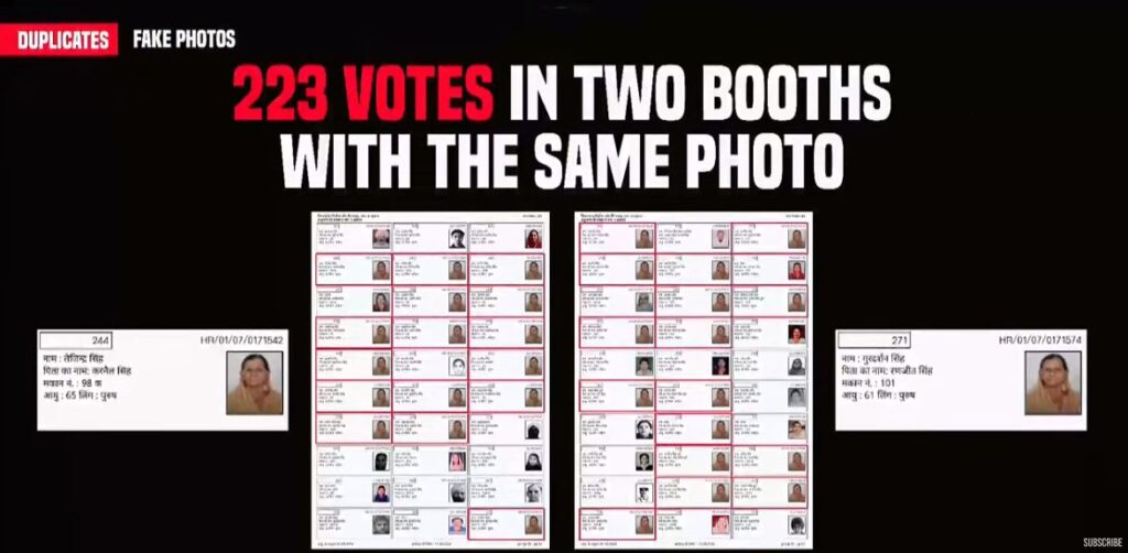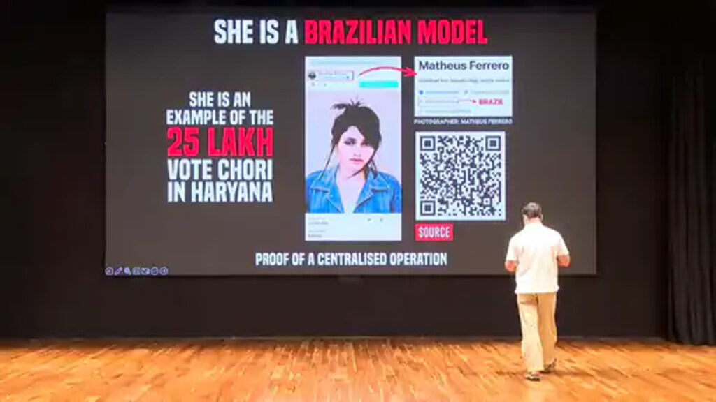हरियाणा में 25 लाख वोटों की चोरी का दावा: राहुल गांधी ने सीधे तौर पर आरोप लगाया कि हरियाणा विधानसभा चुनाव 2024 में 25 लाख वोटों की चोरी हुई है, जिससे कांग्रेस को हार का सामना करना पड़ा। उन्होंने इसे साबित करने के लिए ब्राजीलियन मॉडल की तस्वीर दिखाकर दावा किया कि उसने हरियाणा की वोटर लिस्ट में अलग-अलग नाम और 10 बूथों पर 22 बार वोट डाला।