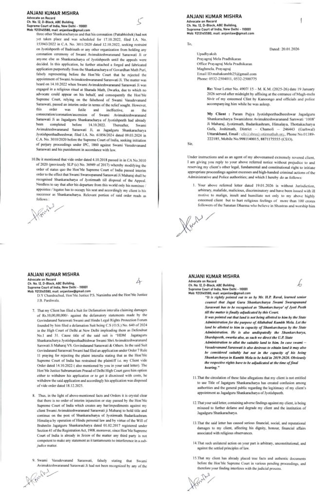मेला प्राधिकरण के एक पेज के नोटिस के जवाब में स्वामी अविमुक्तेश्वरानंद की ओर से 8 पन्नों का अंग्रेजी में लिखा गया जवाब भेजा गया है। इस पत्र में उन्होंने धार्मिक परंपराओं, शास्त्रों, गुरु-शिष्य परंपरा और ऐतिहासिक तथ्यों का हवाला देते हुए अपने शंकराचार्य होने का दावा दोहराया है।