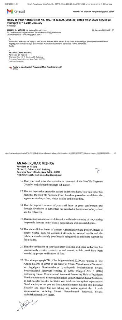 स्वामी अविमुक्तेश्वरानंद की ओर से यह जवाब माघ मेला प्राधिकरण की आधिकारिक ई-मेल आईडी पर भी भेजा गया और साथ ही सेक्टर-4 में स्थित मेला प्राधिकरण के कार्यालय में भी पहुंचाया गया।